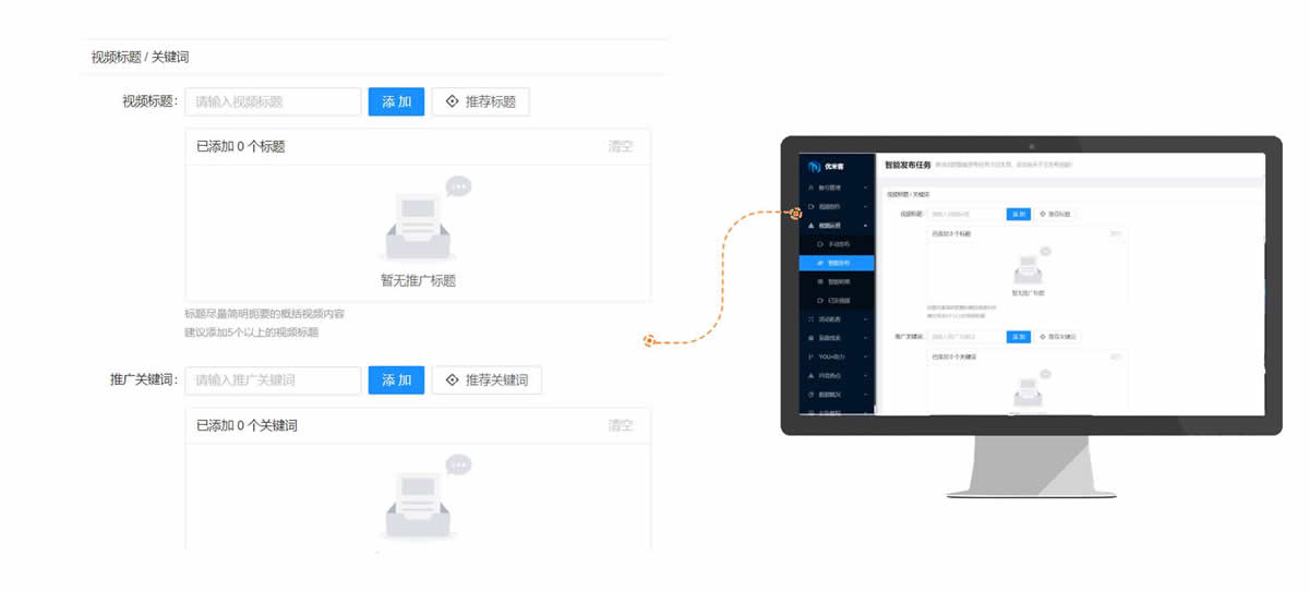把视频发布到各大平台,其中分为手动发布和智能定时发布,系统对发布出去的视频进行自动优化,提高视频排名。 |