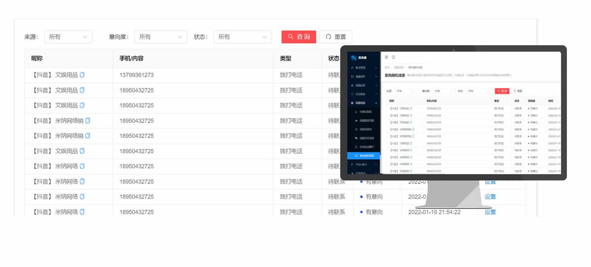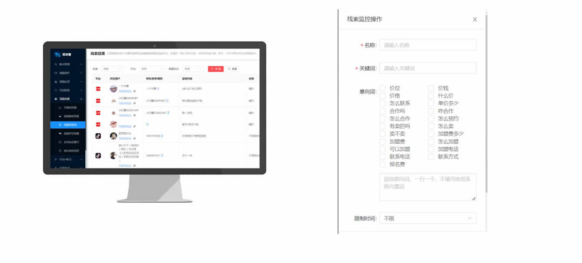 对评论、留资、私信的用户进行归类分析,排除无意向的客户减少人员成本提高销售效率! |