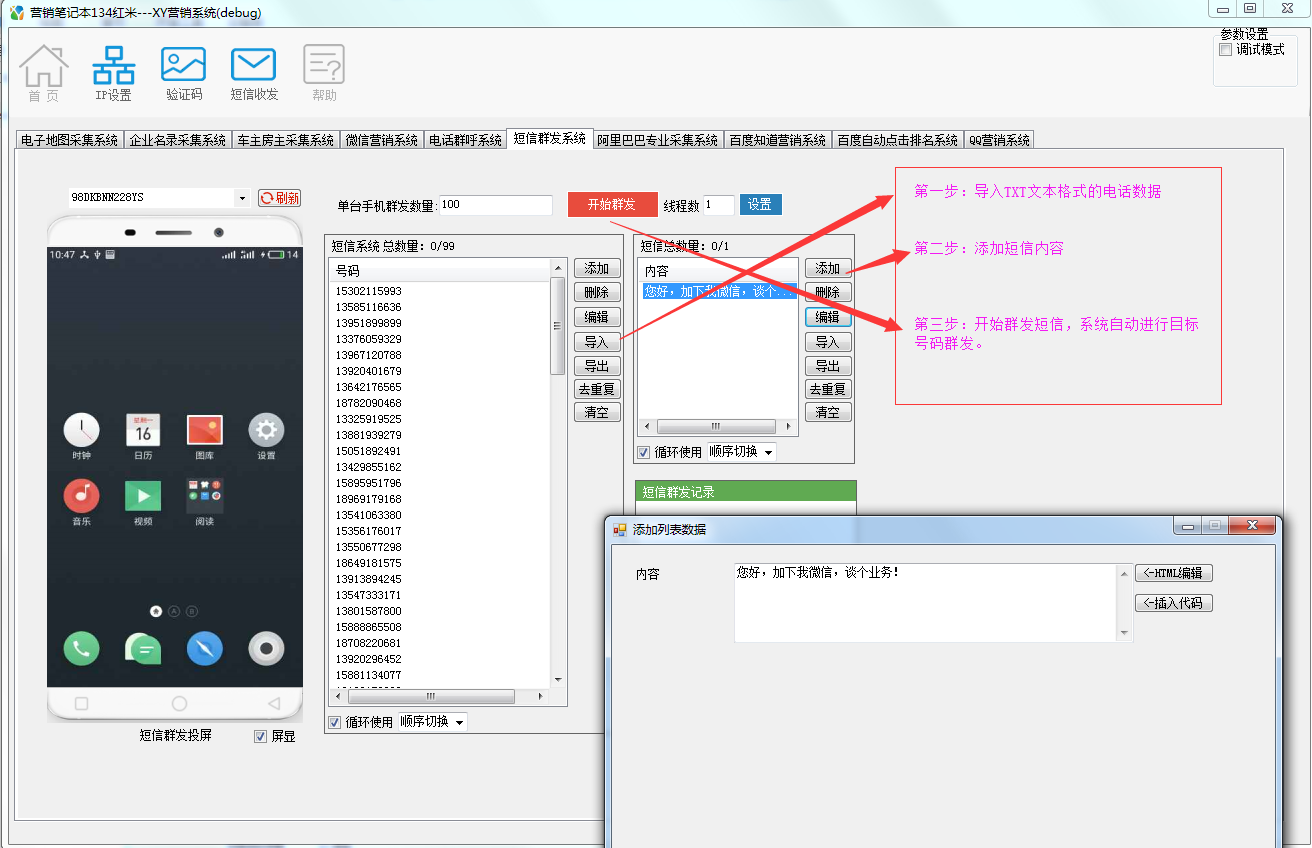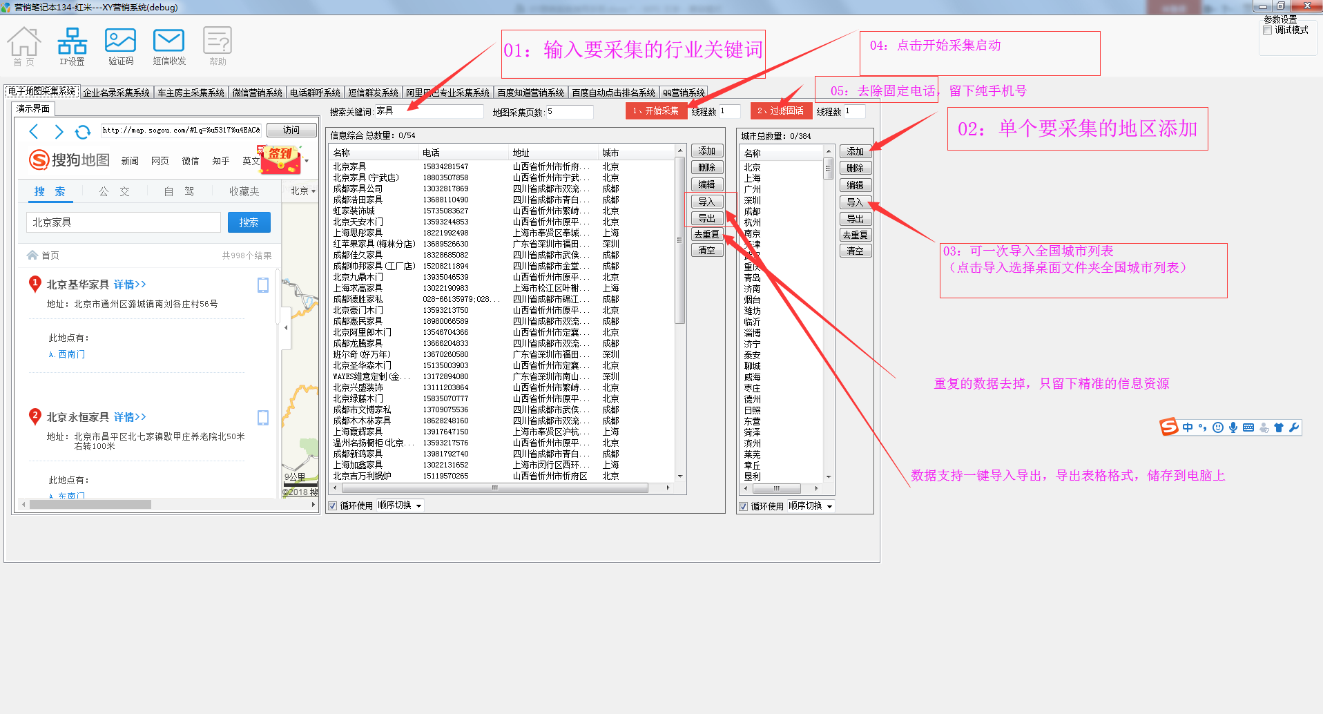 (第五步)采集出来的数据,进行固话的过滤,留取的全部是可营销的手机号码、列表内采集的数据可点击去重复,只留取精准的信息资源。